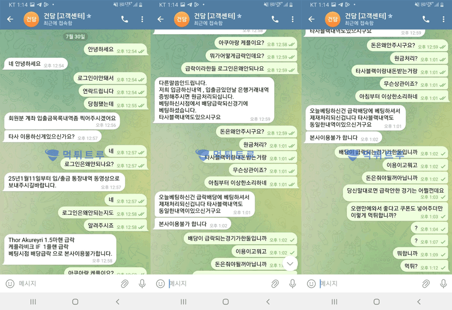고객센터 텔레그램 계정 남아있길래 최후의 보루라 생각하고 로그인 왜 안되는지 문의했더니 타사 이용한 적 있냐면서 밑밥 까는 거 보고 전형적인 먹튀사이트라는 걸 깨달았네요.
